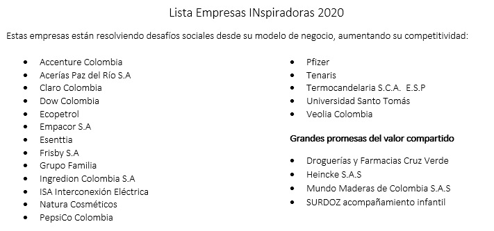 La ‘Lista de Empresas INspiradoras’ no es un ranking, ni es un premio, sino un instrumento para visibilizar a las organizaciones en Colombia que han comprendido que el sector privado está en capacidad de generar grandes transformaciones en la sociedad en la medida en que los empresarios actúen como tal y vean los desafíos sociales como oportunidades para sus negocios.