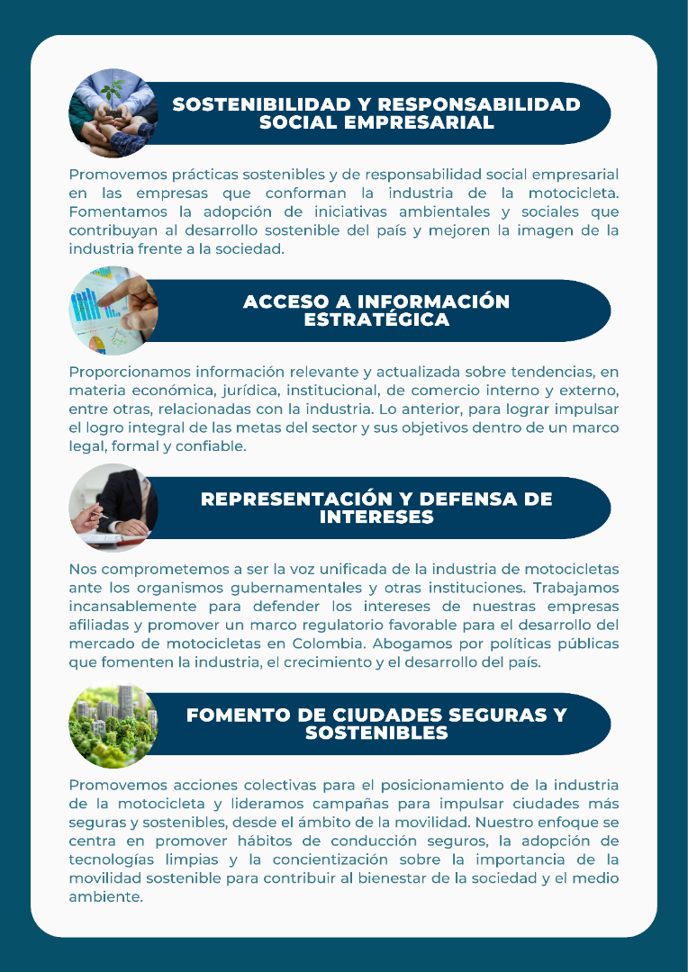 Respalda a los más de 11 millones de colombianos que día a día progresan gracias al uso de la motocicleta y evidenciamos que la motocicleta es el vehículo aliado de la inclusión social y el progreso del país. Un movimiento que trabaja para proteger la vida con la promoción de la seguridad vial de los y las motociclistas, de sus familias, del resto de actores viales y de los colombianos.
