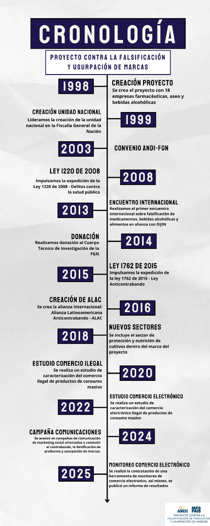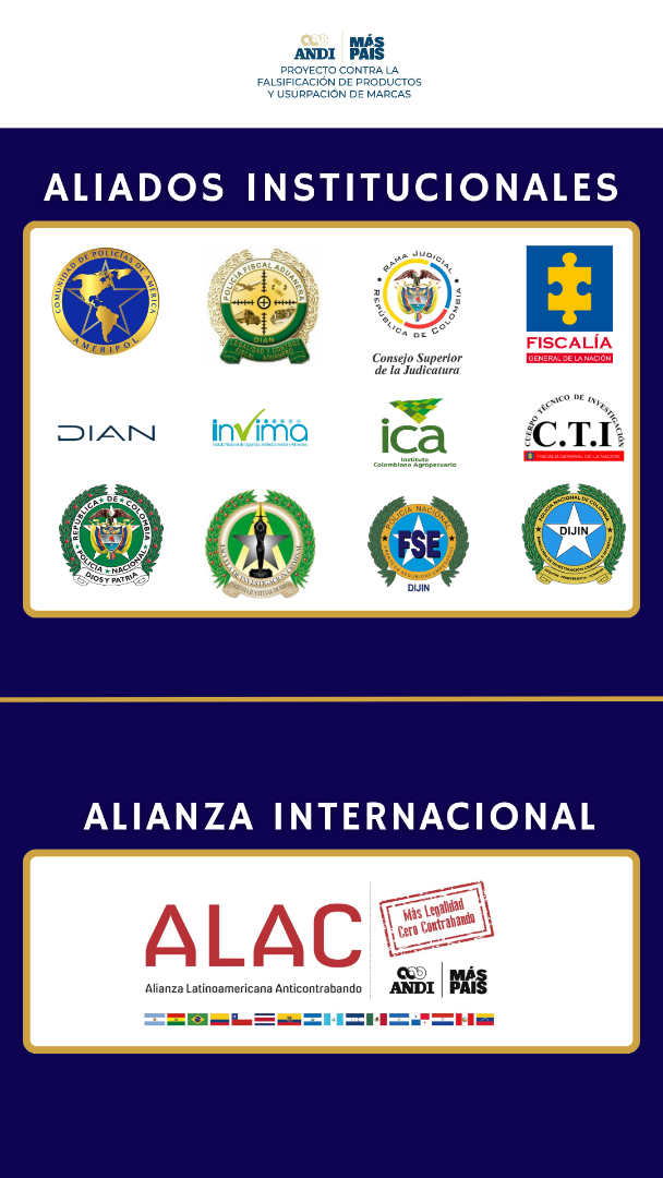 Somos un proyecto enmarcado en las actividades de la Asociación Nacional de Empresarios de Colombia (ANDI), creado en 1998, que trabaja por la articulación público-privada en la generación de estrategias para prevenir y combatir el comercio ilegal de productos que atentan contra la salud y la vida de consumidores y pacientes.
