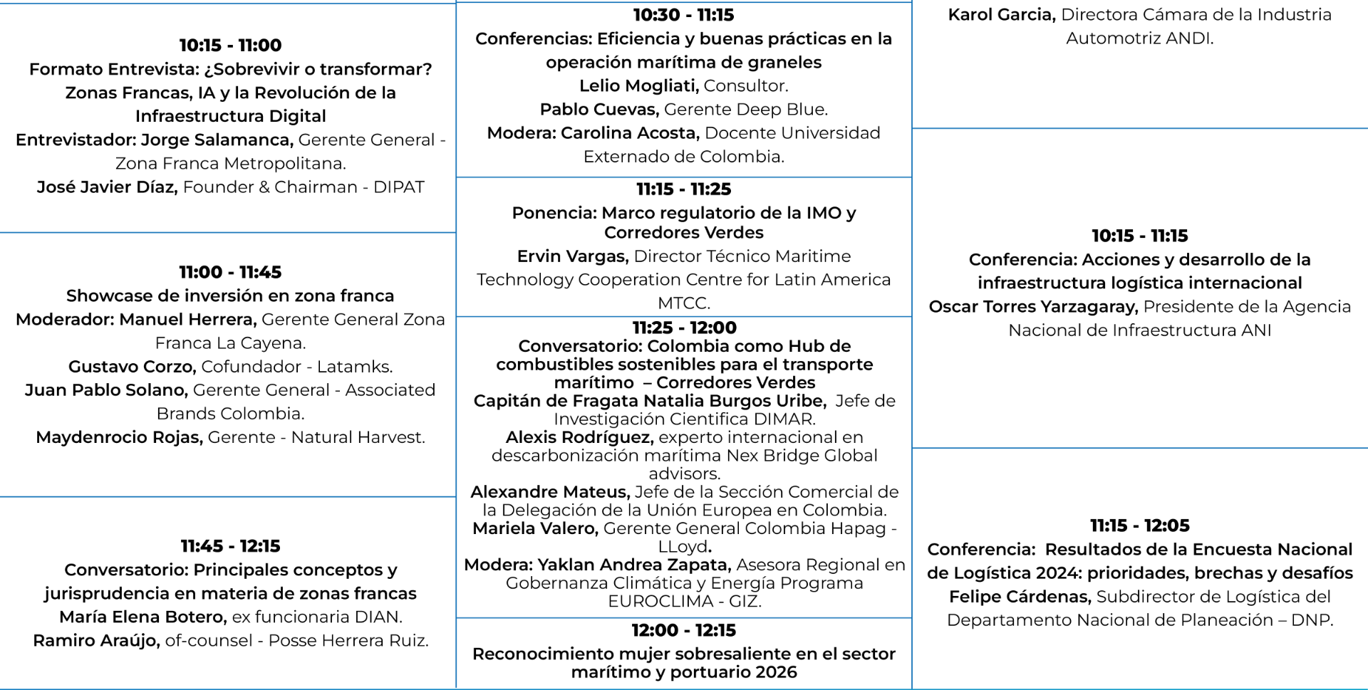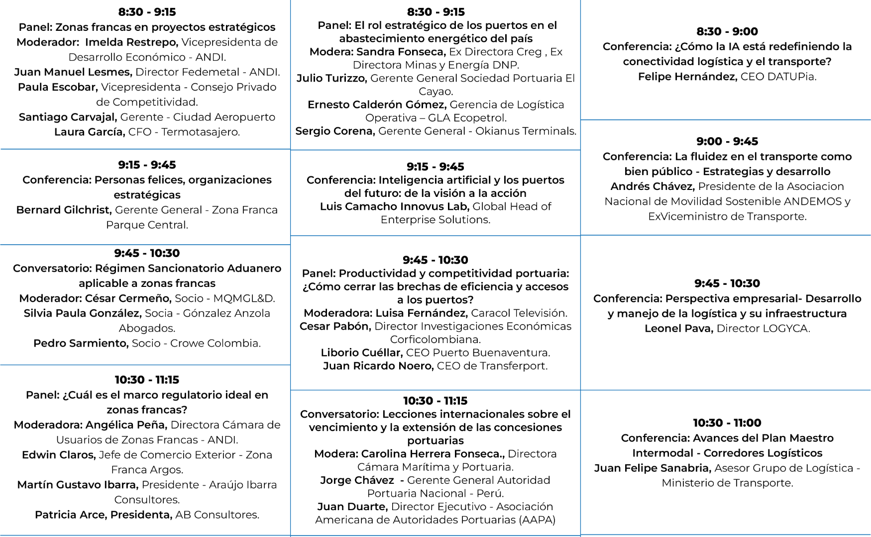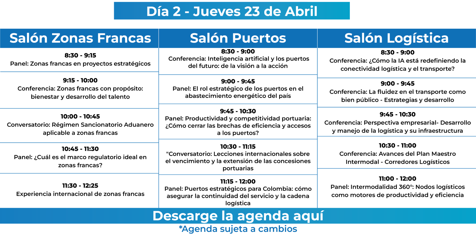 Se presentarán las tendencias globales en logística, zonas francas y puertos, así como el análisis de proyectos estratégicos para el país, la internacionalización y los potenciadores de crecimiento y construcción de un futuro mejor para Colombia.