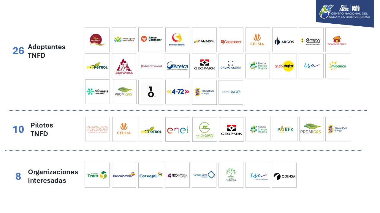 Los Comités Técnicos del Agua y la Biodiversidad son espacios de aprendizaje multisectorial dirigidos a empresas, cámaras y seccionales de la ANDI para facilitar el intercambio de conocimientos y fortalecimiento de capacidades en agua, biodiversidad y adaptación al cambio climático. |