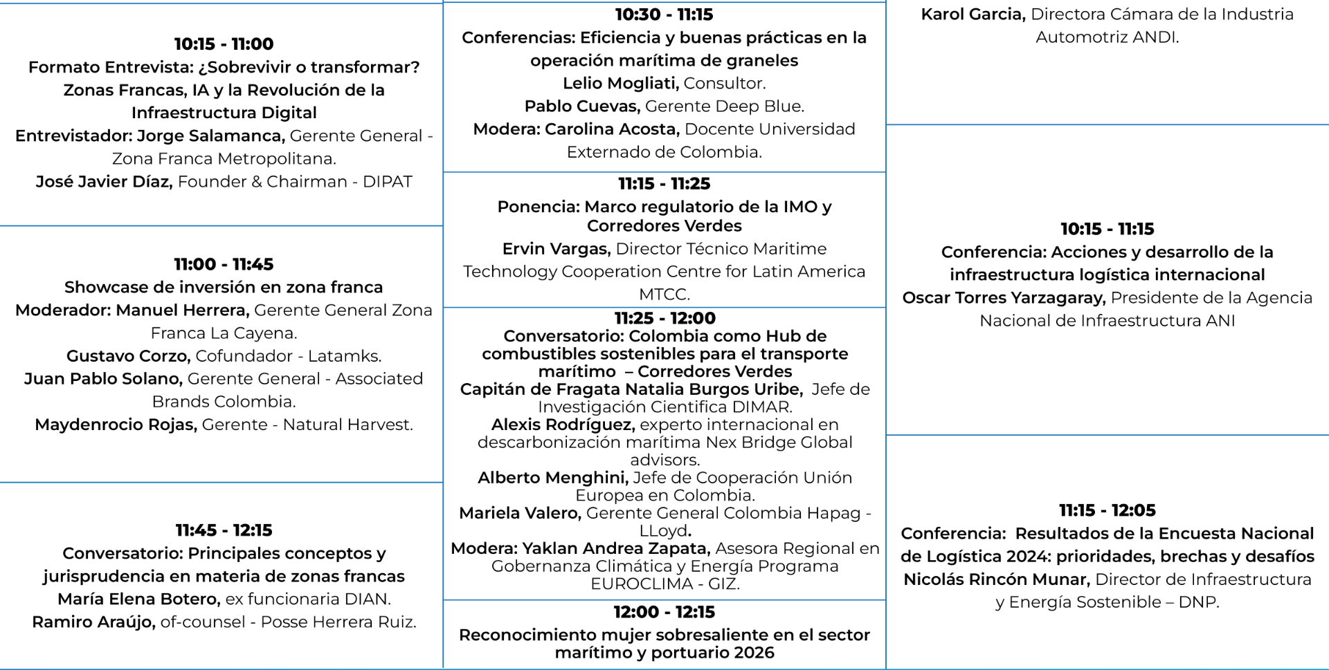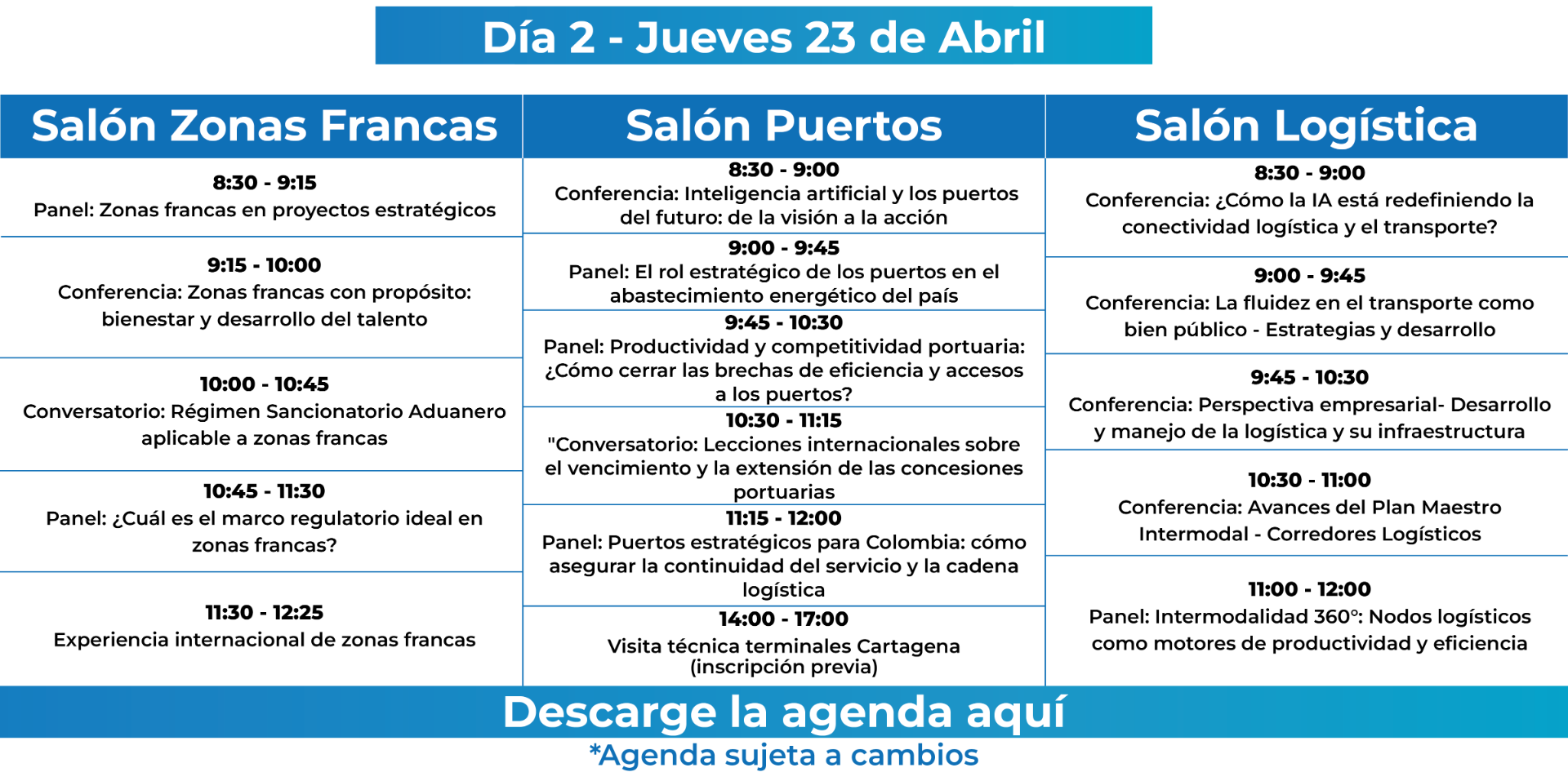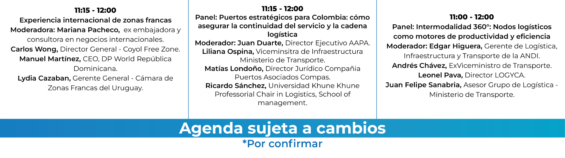 Se presentarán las tendencias globales en logística, zonas francas y puertos, así como el análisis de proyectos estratégicos para el país, la internacionalización y los potenciadores de crecimiento y construcción de un futuro mejor para Colombia.