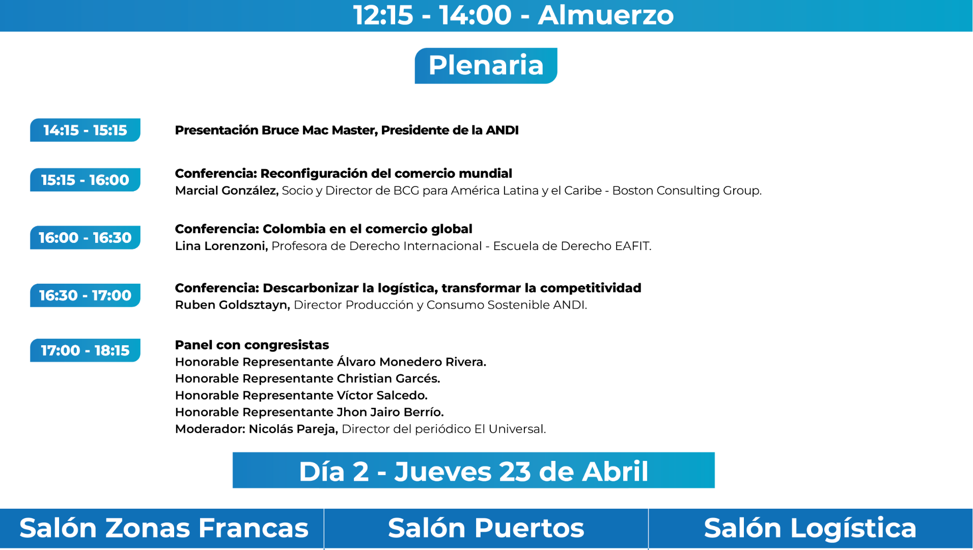 El próximo 22 y 23 de abril, la ANDI realizará el 9° Congreso Integrado de Logística, Zonas Francas y Puertos en el Centro de Convenciones de Cartagena. Como todos años, será el punto de encuentro de empresarios, consultores, académicos, miembros del Gobierno Nacional y de todos los actores de la cadena de logística, zonas francas y puertos a nivel nacional e internacional.