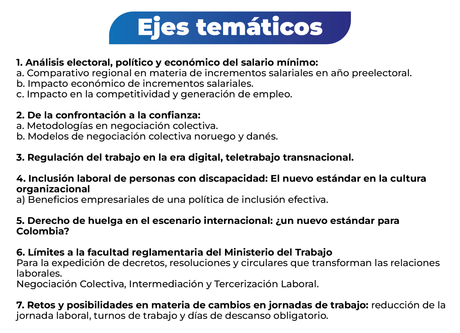 Asimismo, se desarrollarán espacios de discusión sobre la inclusión laboral de personas con discapacidad como nuevo estándar de la cultura organizacional, el derecho de huelga en el escenario internacional y sus posibles implicaciones para Colombia, los límites a la facultad reglamentaria del Ministerio del Trabajo, y los principales retos asociados a los cambios en las jornadas laborales, como la reducción de la jornada, los turnos de trabajo y los días de descanso obligatorio.