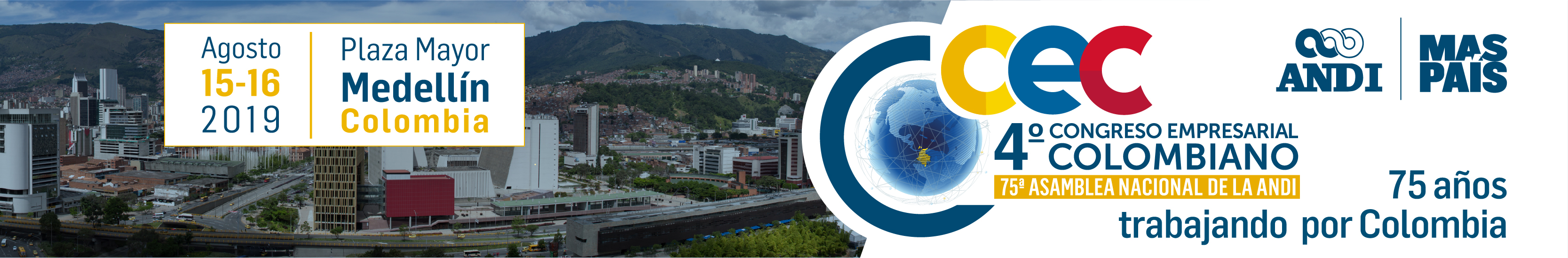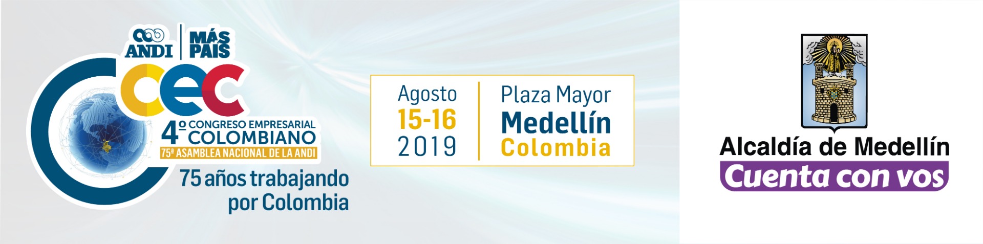 En el año en que se cumple el aniversario número 75 trabajando por el desarrollo de la industria y empresariado nacional tenemos el agrado de invitarlo al cuarto Congreso Empresarial Colombiano y 75ª Asamblea Nacional de la ANDI la cual se llevará a cabo los próximos 15 y 16 de agosto del 2019 en la ciudad de Medellín.