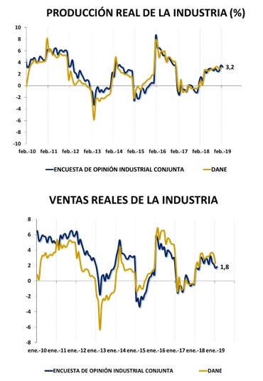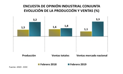 De acuerdo con los resultados de la Encuesta de Opinión Industrial Conjunta (EOIC), que la ANDI realiza con ACICAM, ACOPLASTICOS, ANDIGRAF y CAMACOL, en febrero de 2019, comparado con el mismo mes de 2018, la producción aumentó 3,2%, las ventas totales 1,8% y, dentro de éstas, las ventas hacia el mercado interno 3,3%. En el año inmediatamente anterior, estas tasas eran de 1,5%, 1,6% y 1,1%, respectivamente.