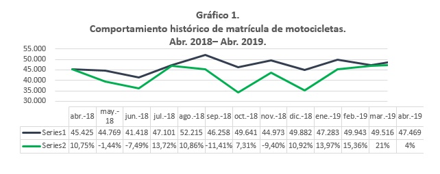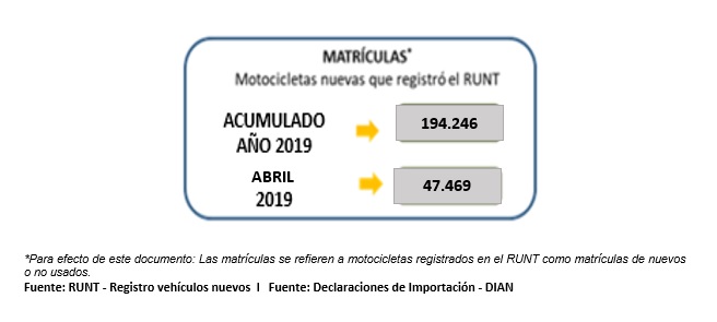El mes de abril arrojó un total de 47.469 matrículas registradas en el país, 6.455 matrículas más que en el mismo mes de 2018, lo que representa un incremento del 4% y reafirma la preferencia de los colombianos por la motocicleta y el acumulado de 2019 alcanza 194.246 unidades, con un crecimiento del 13.45%.