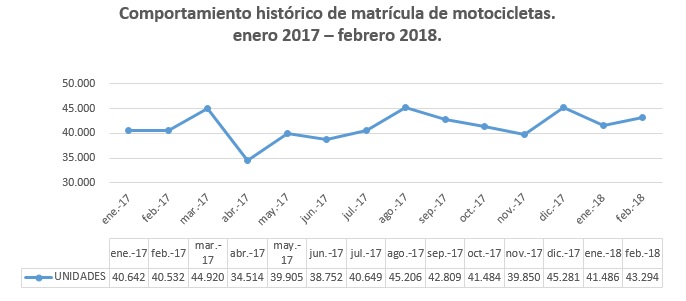 En el mes de febrero de 2018 se matricularon en el país 2.762 motocicletas más frente al mismo mes del año inmediatamente anterior, y se matricularon 1.808 motocicletas más respecto a enero de 2018. Así mismo, es de destacar, que frente al acumulado a febrero de 2017, en el 2018 se matricularon en el país 3.606 motocicletas más, lo que constituye un crecimiento del 4,25% del mercado.