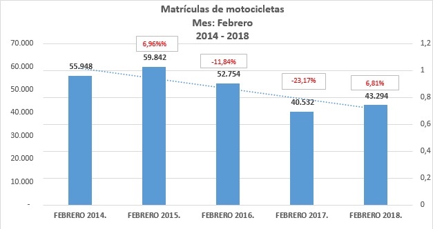 Febrero del 2018 ocupa el cuarto lugar en el histórico de ventas del mes, sin embargo, el total de motcicletas matriculadas fue de 43.294 unidades que, frente a las 40.532 matrículas en febrero de2017, constituyen un crecimiento del 6,81%.