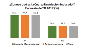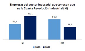 El porcentaje de empresarios que conoce qué es la Cuarta Revolución Industrial tuvo grandes avances en el último año. En 2017, el 65.2% del total los empresarios se manifestaron positivamente, con porcentajes muy similares entre el sector industrial (65.1%) y los del resto de sectores (65.3%). Es importante destacar, el aumento significativo en la industria manufacturera, teniendo en cuenta que en 2016 el 43.7% contestaron que conocían de los beneficios, retos y el costo de oportunidad de adaptarse a la economía digital y para 2017, el porcentaje aumentó al 65.1%.