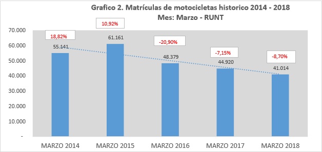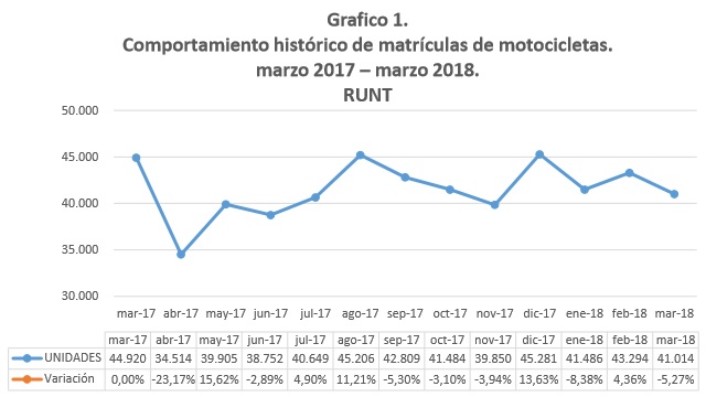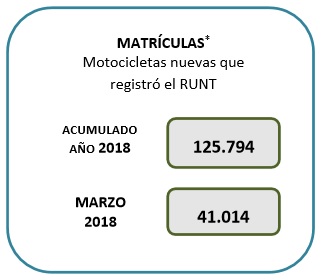 En el acumulado a marzo de 2018 se matricularon en el país 300 motocicletas menos frente al mismo periodo acumulado del año 2017, equivalente a -0,24% de variación.