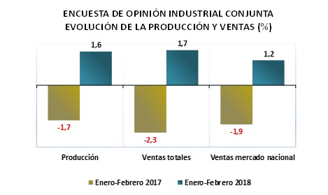 De acuerdo con los resultados de la Encuesta de Opinión Industrial Conjunta (EOIC), que la ANDI realiza con ACICAM, ACOPLASTICOS, ANDIGRAF y CAMACOL, en período enero-febrero de 2018, comparado con el mismo lapso de 2017, la producción aumentó 1,6%, las ventas totales 1,7% y, dentro de éstas, las ventas hacia el mercado interno 1,2%. En el año inmediatamente anterior, estas tasas eran de -1,7%, -2,3% y -1.9%, respectivamente.