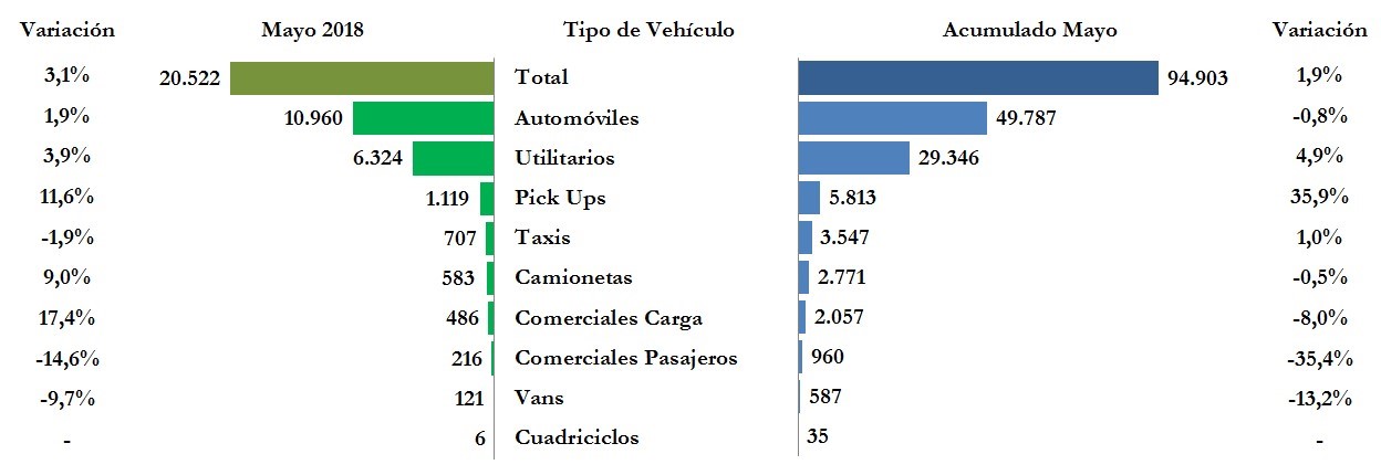 El total de matrículas del sector automotor en el mes de mayo de 2018 fue de 20.522 vehículos, que representaron un aumento de 3,1% respecto al mismo mes del año anterior cuando se matricularon 19.898 unidades. Entre enero y mayo se matricularon 94.903 vehículos, con un aumento de 1,9% respecto al mismo período del año anterior, cuando se matricularon 93.148 vehículos. En el acumulado del año se destacaron los segmentos de utilitarios, pickups y taxis, con crecimientos de 4,9%, 35,9% y 1,0% respectivamente, frente al año anterior.