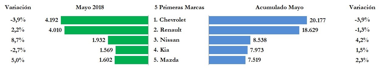 Las cinco marcas con mayor número de matrículas acumuladas de enero a mayo, fueron Chevrolet, Renault, Nissan, Kia y Mazda, con participaciones de mercado de 21,3%, 19,6%, 9,0%, 8,4% y 7,9%, respectivamente, que representaron el 66,2% del mercado. En relación con el mismo período del año anterior, Nissan, Kia y Mazda, aumentaron 4,2%, 1,5% y 2,3%, en tanto que Chevrolet y Renault, disminuyeron 3,9% y 1,3%, respectivamente.