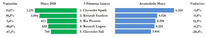 Acumulado al mes de mayo, Chevrolet Spark con una participación del 6,7%, Renault Sandero con el 4,8%, Kia Picanto con 4,6%, Renault Logan con 4,4% y Chevrolet Sail con el 4,0% del mercado, ocuparon los cinco primeros lugares de matrículas en el país; estas cinco líneas representaron el 24,5% del total matriculado. En relación con el acumulado a mayo del año anterior, Kia Picanto aumentó 11,5%, en tanto que Chevrolet Spark, Renault Sandero, Renault Logan y Chevrolet Sail, disminuyeron 1,8%, 0,8%, 6,2% y 28,4%, respectivamente.