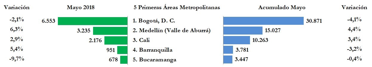 En los cinco primeros meses del año, las ciudades y sus áreas metropolitanas con mayor número de vehículos matriculados fueron Bogotá, D.C., Medellín y el área metropolitana del Valle de Aburrá, Cali, Barranquilla y Bucaramanga, con participaciones de mercado de 32,5%, 15,8%, 10,8%, 4,0% y 3,6%, respectivamente, que en conjunto representaron el 66,8% del mercado nacional. Frente a los cinco primeros meses del año anterior, Medellín (Valle de Aburrá) y Cali, aumentaron 4,4% y 3,4%, en tanto que Bogotá, D.C., Barranquilla y Bucaramanga, disminuyeron 4,1%, 3,2% y 0,4%, respectivamente.