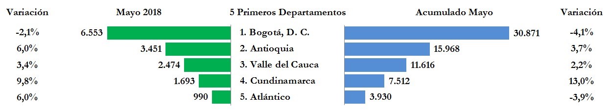 Después de Bogotá, D.C., que logró el 32,5% de participación de matrículas en el acumulado a mayo de 2018, los departamentos de Antioquia, con el 16,8% del mercado, Valle del Cauca, con el 12,2%, Cundinamarca con el 7,9% y Atlántico, con el 4,1%, ocuparon los siguientes lugares en matrículas; estos cinco departamentos representaron el 73,7% del mercado. Respecto al acumulado a mayo del año anterior, Antioquia, Valle del Cauca y Cundinamarca, aumentaron 3,7%, 2,2% y 13,0%, en tanto que Bogotá, D.C. y Atlántico, disminuyeron 4,1% y 3,9%, respectivamente.
