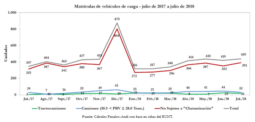 Del total de 2.680 vehículos de carga matriculados en los siete primeros meses del año, 2.341 no estuvieron sujetos a la llamada “política de chatarrización” uno a uno, y representaron el 87,4% del total matriculado. Así, el 12,6% de los vehículos matriculados a julio, –339 unidades–, estuvo sujeto a “chatarrización”, un número bajo de unidades, de las cuales 113 correspondieron a tractocamiones, vehículos en los que se hace el gran comercio interno y externo del país.