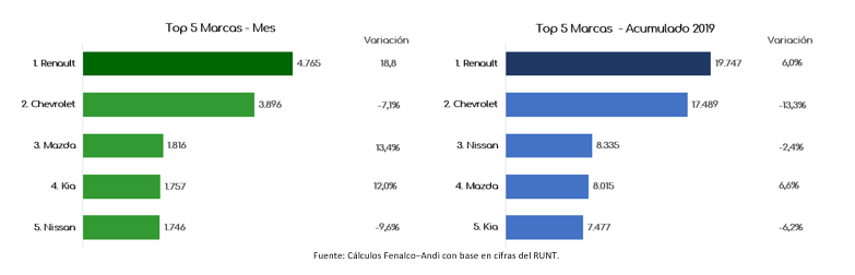 Las cinco marcas con mayor número de matrículas acumuladas en mayo, fueron Renault, Chevrolet, Nissan, Mazda y Kia, con participaciones de mercado en el orden de 20,5%, 18,2%, 8,7%, 8,3% y 7,8%, representando el 63.5% del total de los vehículos matriculados en este período. En relación con el mismo período del año anterior, entre las cinco primeras marcas, Renault y Mazda tuvieron un crecimiento del 6,0% y 6,6%, respectivamente; en tanto que Chevrolet, Nissan y Kia disminuyeron en 13,3%, 2,4% y 6,2%.