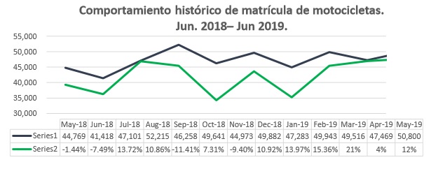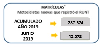 Bogotá, julio 10 de 2019. En el primer semestre de 2019 se matricularon 287.624 motocicletas, 2,8% más que en 2018, mientras que en junio se registraron 42.578 motocicletas nuevas, con un crecimiento del 12% frente al mismo mes del año inmediatamente anterior.