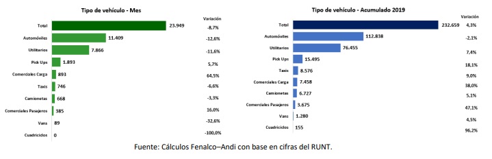 Bogotá, 2 de noviembre de 2019. El total de matrículas del sector automotor en el mes de noviembre de 2019 fue de 23.949 vehículos, que representaron un decrecimiento del 8,7% respecto al mismo mes del año anterior cuando se matricularon 26.245 unidades. En lo corrido del año, se han matriculado 232.659 vehículos, con un crecimiento de 4,3% frente al mismo periodo de 2018. Se destacaron los segmentos de “Cuadriciclos”, “Comerciales de pasajeros” y “Comerciales de carga”, al registrar variaciones del orden de 96%, 47% y 38% respectivamente.