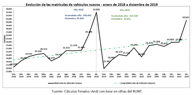 Bogotá, 7 de enero de 2020. La evolución del mercado de vehículos nuevos durante el 2019 fue creciente y cierra el año con una variación del 2,8% respecto al año 2018. Para el año en mención, diciembre fue el mejor mes, registrando 30.661 unidades, lo que significa una participación del 11,6% del total anual, el cual fue de 263.320 unidades. Cabe resaltar que la base comparativa es muy alta (2018) ya que dicho año contó con salón del automóvil, por lo tanto, los resultados del 2019 son muy positivos para el mercado.