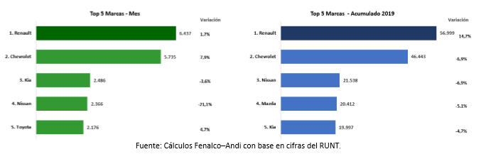 En cuanto a marcas, Renault se consolidó como líder del mercado con 56.999 unidades que representan una variación del 14,7% respecto al año 2018. Los vehículos con combustibles amigables con el medio ambiente – Híbridos y eléctricos – registraron un crecimiento del 237% (3.135 unidades), siendo los vehículos híbridos los que tienen un mayor efecto cerrando el año con 2.209 unidades con un crecimiento del 310% y los eléctricos con 926 unidades con un crecimiento del 137%; el mayor repunte de los vehículos híbridos representa un paso intermedio para la llegada de los vehículos eléctricos.