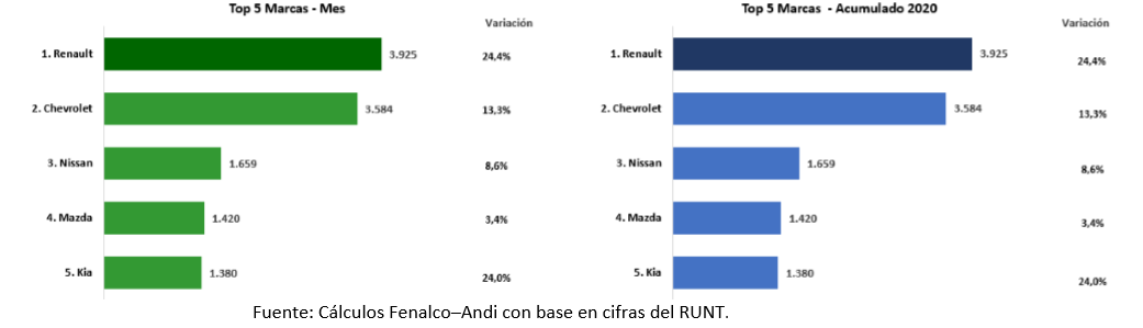 Las cinco marcas con mayor número de matrículas en el mes de enero fueron: Renault, Chevrolet, Nissan, Mazda y Kia con participaciones de mercado en el orden de 21,3%, 19,5%, 9%, 7,7% y 7,5% representando el 65% del total de vehículos matriculados en el primer mes del año. Las cinco marcas que se encuentran dentro del top cinco mostraron crecimientos significativos siendo Renault y Kia las que se destacan con el 24,4% y 24% respectivamente.