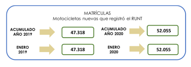 Bogotá, 10 de febrero de 2020. De acuerdo con la información de matrículas procesada por el RUNT, en enero de 2020 se matricularon 52.055 motocicletas, con un crecimiento de 10,01% en relación al mismo mes de 2019.