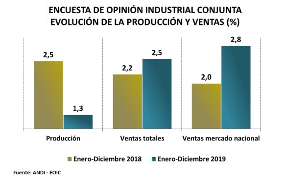 De acuerdo con los resultados de la Encuesta de Opinión Industrial Conjunta (EOIC), que la ANDI realiza con ACICAM, ACOPLASTICOS, ANDIGRAF y CAMACOL, en el período enero-diciembre de 2019, comparado con el mismo periodo de 2018, la producción aumentó 1,3%, las ventas totales 2,5% y, dentro de éstas, las ventas hacia el mercado interno aumentaron 2,8%.