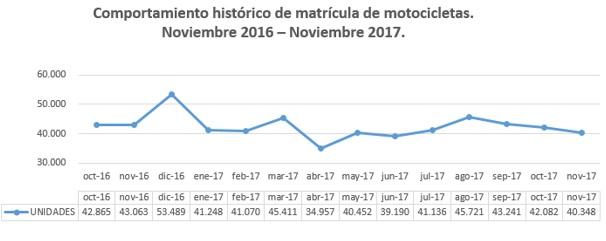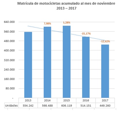 En lo corrido del año, el acumulado fue de 449.260 motocicletas matriculadas, que representan una caída de 12,62% respecto al mismo periodo del año anterior. En el mes de noviembre, el total de matrículas fue de 40.348 unidades, que frente a las 43.063 matrículas de noviembre de 2016, constituyen una disminución de 6,30%.