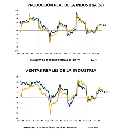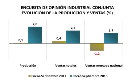 De acuerdo con los resultados de la Encuesta de Opinión Industrial Conjunta (EOIC), que la ANDI realiza con ACICAM, ACOPLASTICOS, ANDIGRAF y CAMACOL, en el período enero-septiembre de 2018, comparado con el mismo periodo de 2017, la producción aumentó 2,8%, las ventas totales 2,2% y, dentro de éstas, las ventas hacia el mercado interno aumentaron 1,7%. En el año inmediatamente anterior, estas tasas eran de -0,3%, 2,0% y -1,3%, respectivamente.